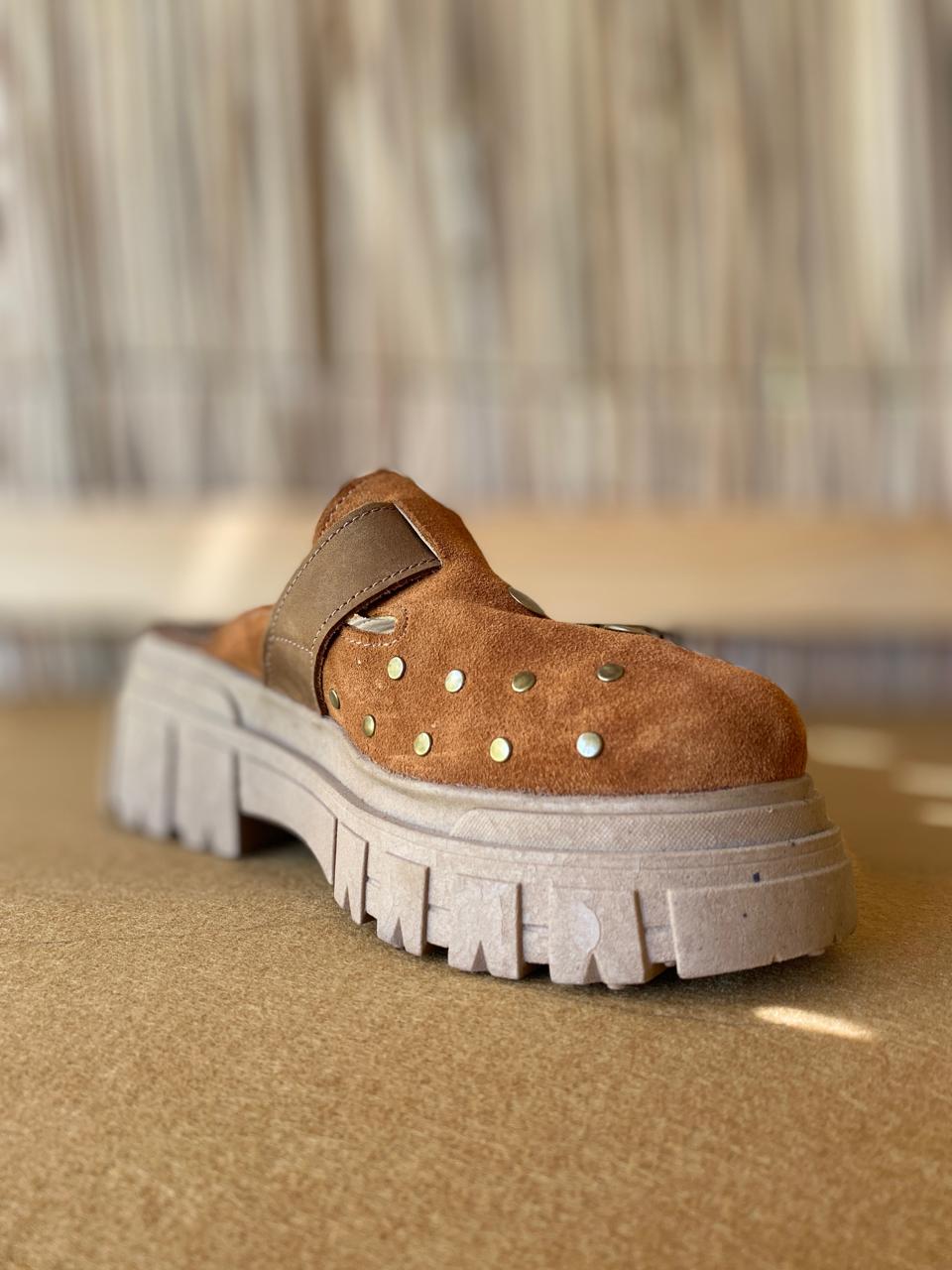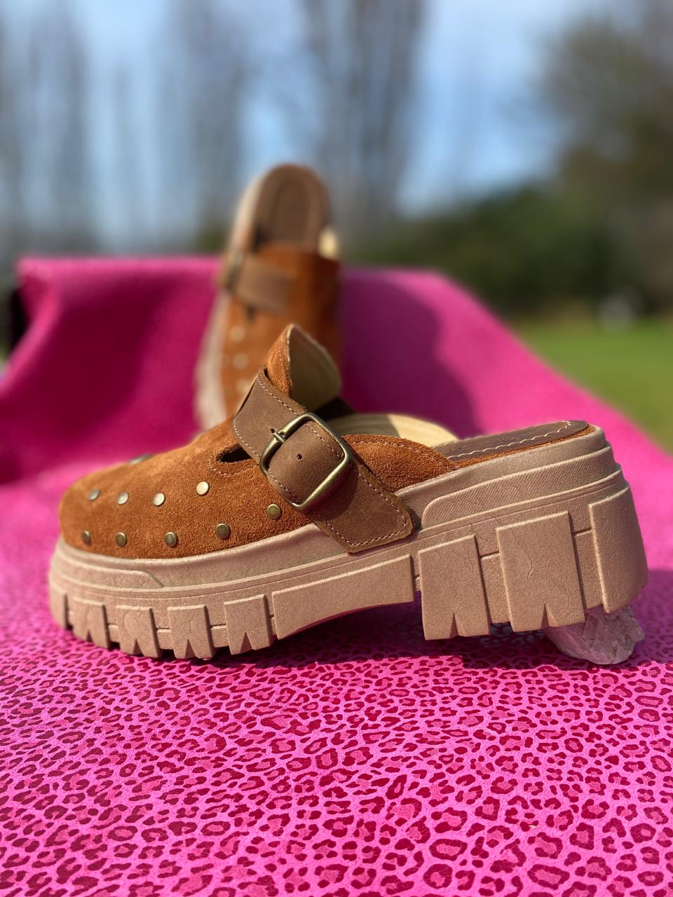 Zueco de cuero natural premium, hecho a mano en Chile, cómodos y fáciles de combinar.
